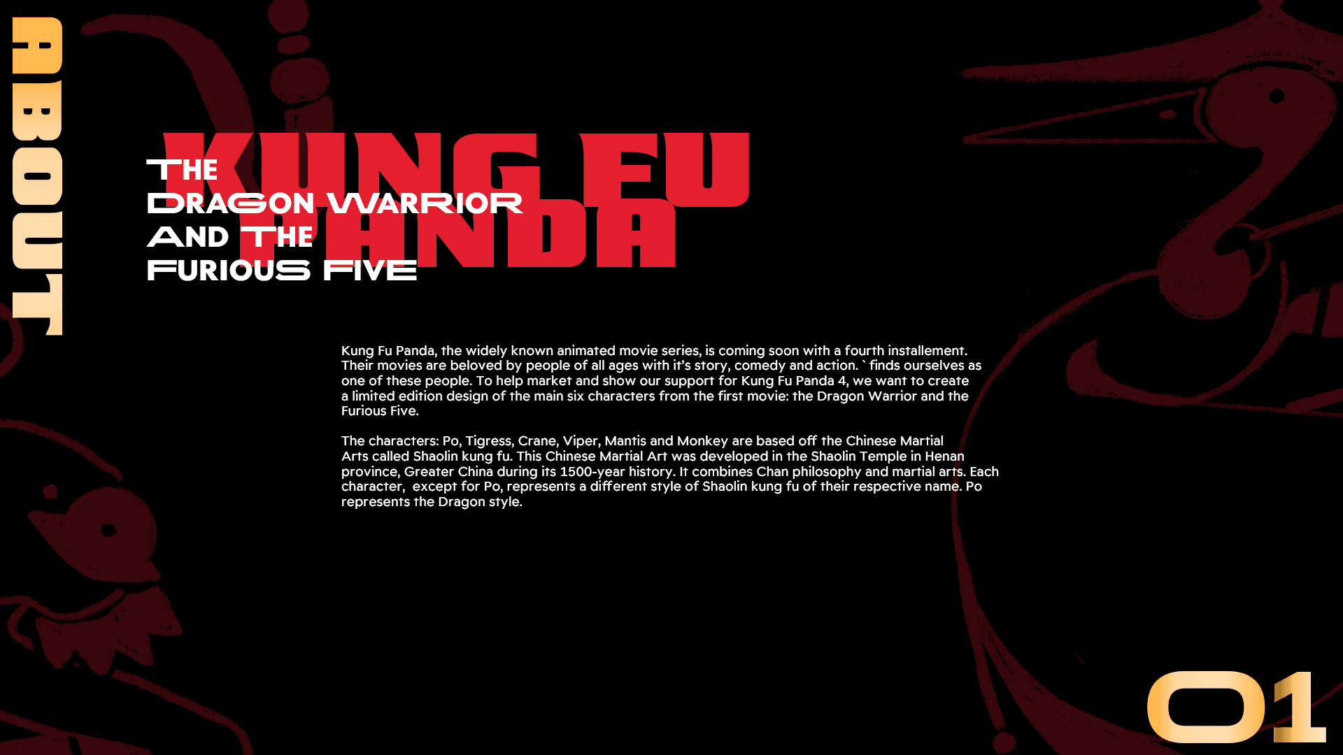 Kung Fu Panda, the widely known animated movie series, is coming soon with a fourth installment. Their movies are beloved by people of all ages with it’s story, comedy and action, we find ourselves as one of these people. To help market and show our support for Kung Fu Panda 4, we want to create a limited edition design of the main six characters from the first movie: the Dragon Warrior and the Furious Five.